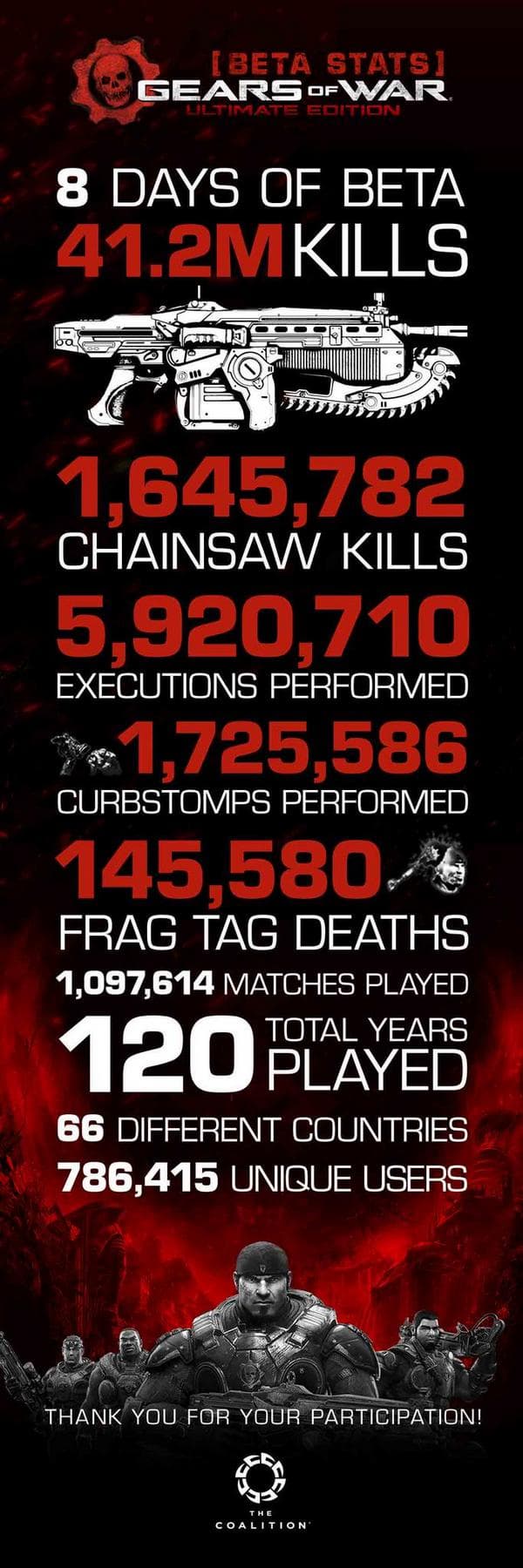 В течение первых 8 дней участники бета-теста совершили более 41 млн убийств, включая 1,6 убийств бензопилой, сделали почти 6 млн добиваний и погибли от гранат в 145 тыс. случаях. На данный момент в бета-тесте приняли участие более 786 тыс пользователей из 66 стран, которые сыграли более 1 млн матчей.