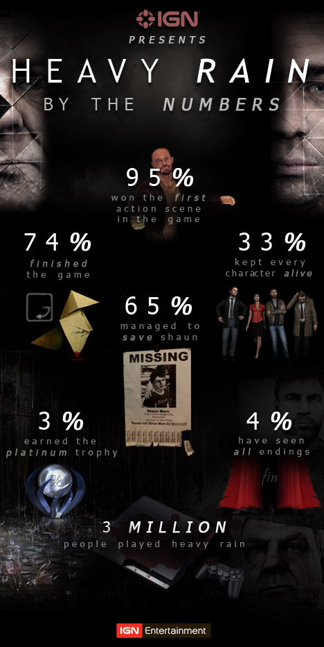 На сайте IGN опубликовали свежую статистику по игре, из которой видно, что процент завершивших прохождение игроков, увеличился до 74%. Интересно, что 33% игрокам, прошедших Heavy Rain, удалось сохранить живыми всех героев, а всего 4% увидели все возможные концовки. Еще меньше - 3% - заработали платиновую награду.