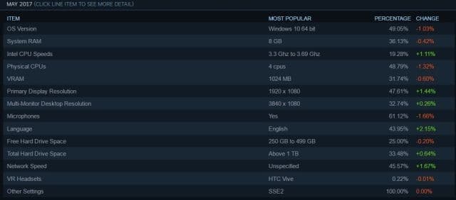 Самыми популярными видеокартами покупателей Steam остаются NVIDIA (62%), а процессором Intel (80%). Самое популярное устройство виртуальной реальности – HTC Vive (60%), им владеют 0,22% пользователей. Системой Windows 10 64-bit пользуются более 49%.
