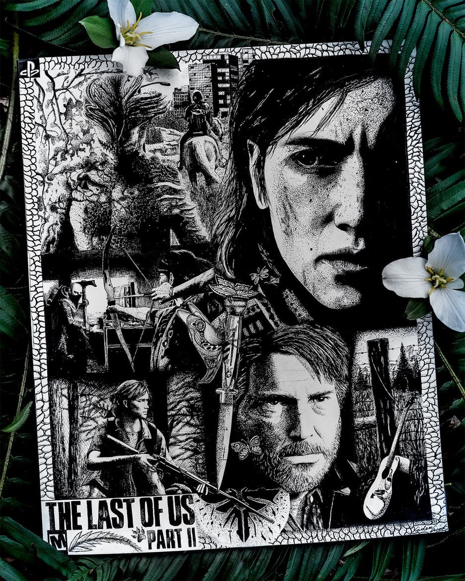 В этот раз внимание разработчиков привлёк фан-арт The Last of Us Part 2 за авторством Кадена Сварта. Картина впечатляет проработкой деталей, а на её создание у Кадена ушло почти 50 часов. На картине можно увидеть различные кадры из игры, выполненные в чёрно-белой стилистике. Гитара и нож прилагаются.