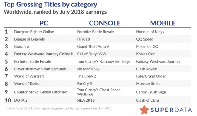 Аналитики рынка Superdata в июльском отчёте уделили внимание четырём крупным играм: