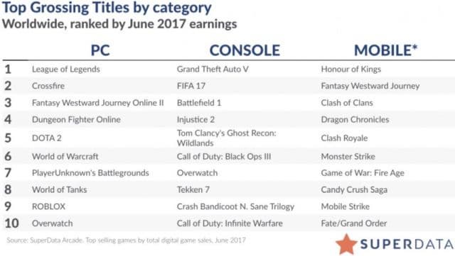 Рейтинг самых прибыльных цифровых версий игр июня 2017 года выглядит следующим образом: