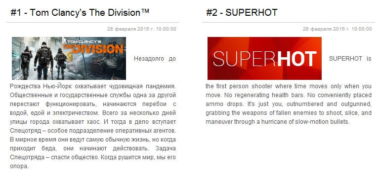 Первое место удерживает мультиплеерный боевик Tom Clancy’s The Division, на втором месте дебютировал инновационный шутер Superhot, время в котором движется, только когда двигаетесь вы сами. Стратегия Master of Orion смогла подняться на четвертое место, а вот шутер Far Cry Primal попал лишь на шестую позицию. Замыкает десятку Grim Dawn.