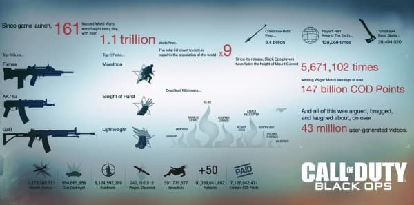 Разработчики из Treyarch не ленятся выкладывать свежую статистику по своему последнему проекту, шутеру от первого лица Call of Duty: Black Ops. На следующей картинке запечатлено много интересной информации.