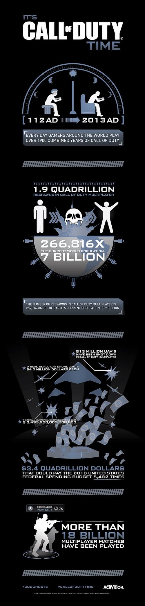 Суммарно количество респаунов в мультиплеере Call of Duty превышает нынешнее население нашей планеты (7 млрд. человек) в 267 тыс. раз. Игроки уничтожили 813 млн. UAV-дронов, стоимость производства каждого реального дрона составляет 4,3 млн. долларов. Всего в мультиплеере Call of Duty зафиксировано уже более 18 млрд. сыгранных матчей.