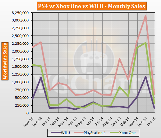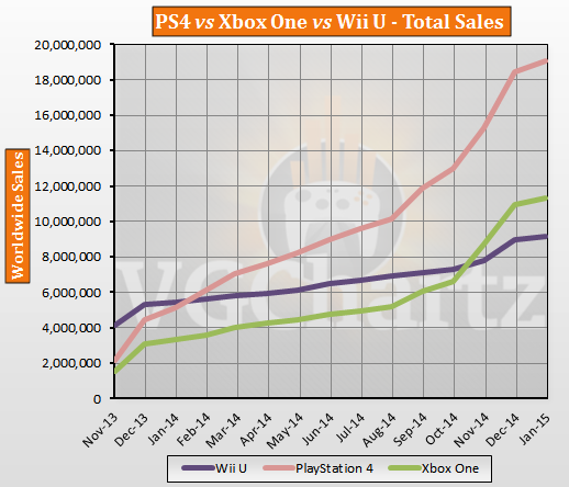 По состоянию на конец января продажи PlayStation 4 превысили отметку 19 млн консолей, Xbox One разменял 11 млн, а Wii U добралась до отметки в 9 млн единиц: