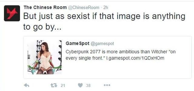 В официальном твиттере студии The Chinese Room (авторы Dear Esther и Everybody's Gone to the Rapture) появилось неоднозначное сообщение. В нём есть ссылка на новость с сайта GameSpot о том, что, по словам представителя CD Projekt RED, новая игра компании Cyberpunk 2077 будет более амбициозной, чем The Wicther «во всех составляющих».