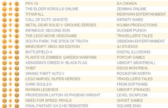 Titanfall продолжает удерживаться на третьей позиции, опережая Call of Duty: Ghosts, который поднялся на несколько строчек вверх после релиза свежего набора карт Devastation.