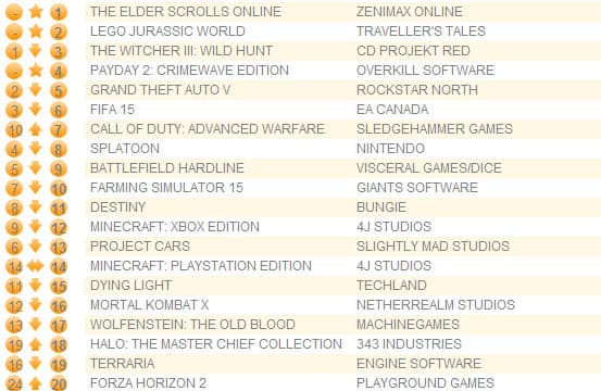 Приключенческая игра Lego Jurassic World дебютировала на втором месте, а вышеупомянутая The Witcher III: Wild Hunt переместилась на третье место. Переиздание Payday 2: Crimewave Edition стартовало с четвертой позиции.