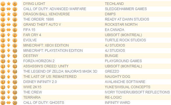 Шутер от третьего лица The Order: 1886, стартовавший неделю назад с первой позиции, опустился на четвертую строчку, а новым лидером оказался зомби-экшен Dying Light, коробочное издание которого вышло через месяц после релиза цифровой версии игры.