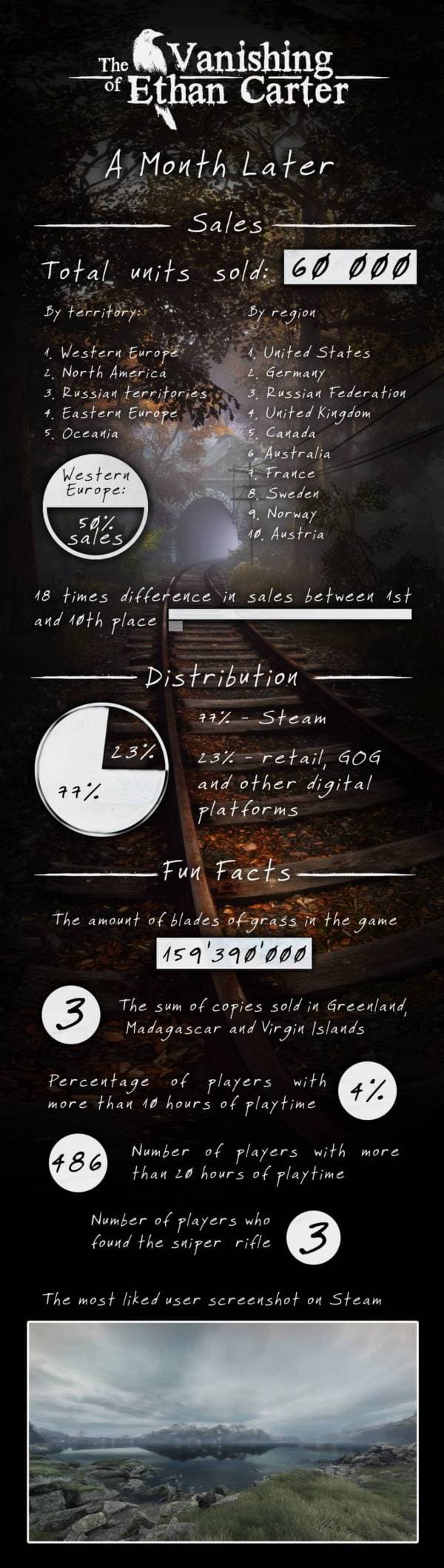 Разработчики из студии The Astronauts сообщили о том, что в течение первого месяца после релиза приключенческой игры The Vanishing of Ethan Carter продажи игры составили 60 тыс. копий.