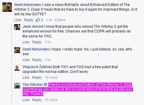 Однако официальный представитель CD Project RED заявил, что это какая-то ошибка, с которой они разберутся, а также добавил, что он ничего не знает о подготовке подобного издания.