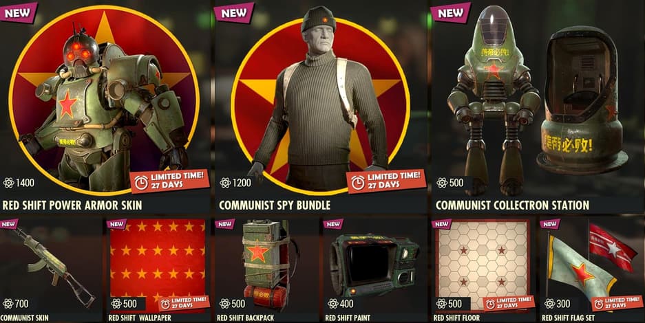 Желающие могут приобрести силовую броню за 1400 атомов, костюм «коммунистического шпиона» за 1200 атомов, а также раскраски для оружия, рюкзака и пип-боя. В наличие есть и комплект «красных флагов» за 300 атомов.