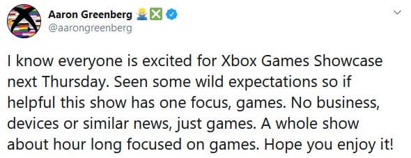 Глава маркетингового отдела Xbox Аарон Гринберг подчеркнул, что мероприятие посвящено исключительно играм. Новостей, связанных с бизнесом и устройствами, ждать не стоит. То есть новостей о стоимости Xbox Series X или дешёвой версии консоли нового поколения не будет.