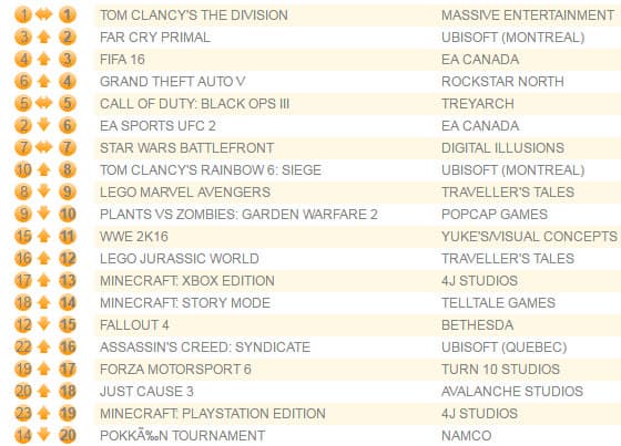 Мультиплеерный шутер Tom Clancy’s The Division удерживается на вершине в течение четырех недель подряд, установив новый рекорд среди всех игр издательства Ubisoft. Второе место досталось еще одной игре от того же издателя, которой стала Far Cry Primal.