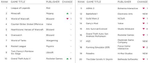 League of Legends от Riot Games лидирует не первый месяц и конкурентов в ближайшее время не предвидится. World of Warcraft поменялся местами с Minecraft и оказался на третьей позиции.
