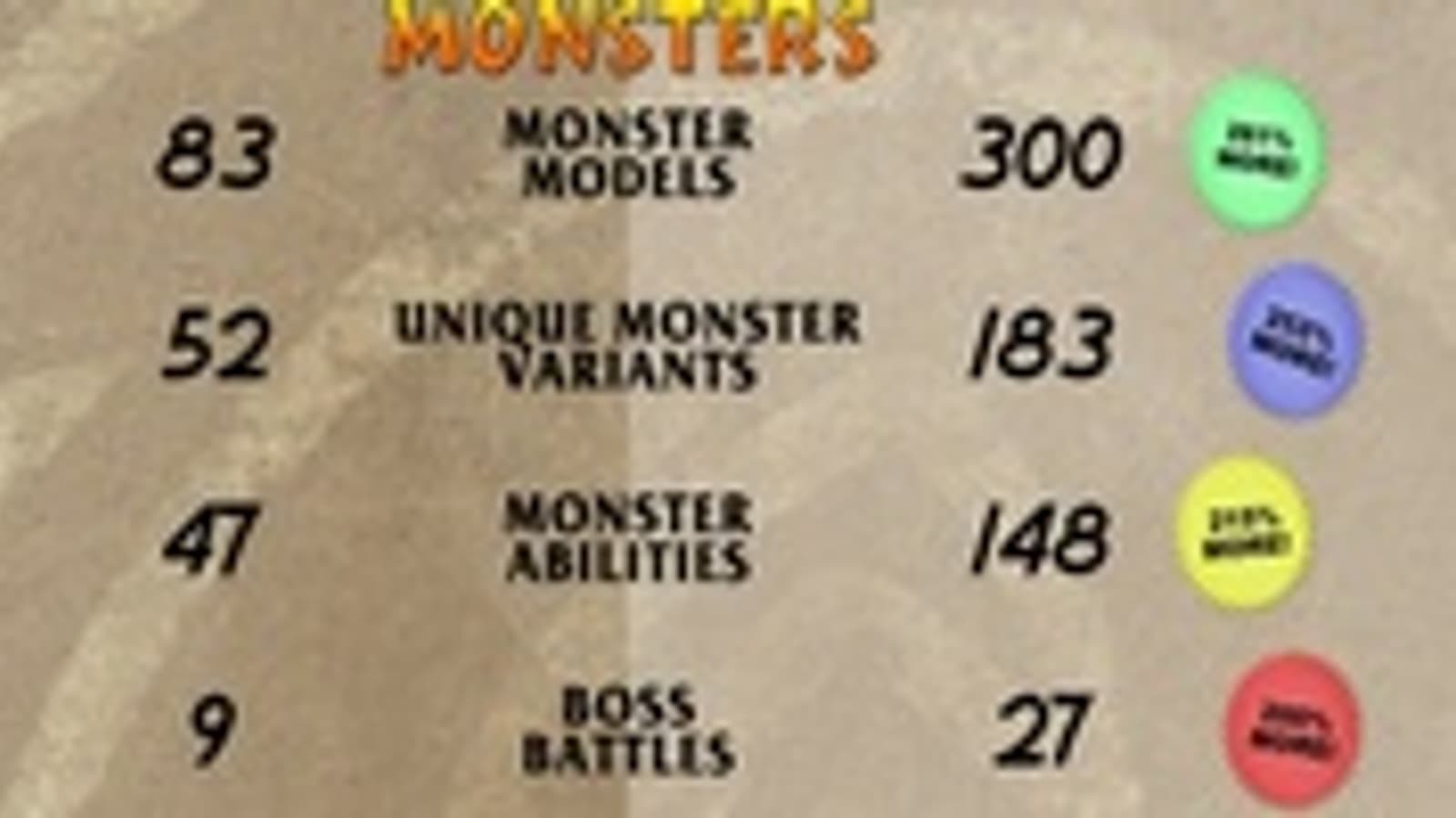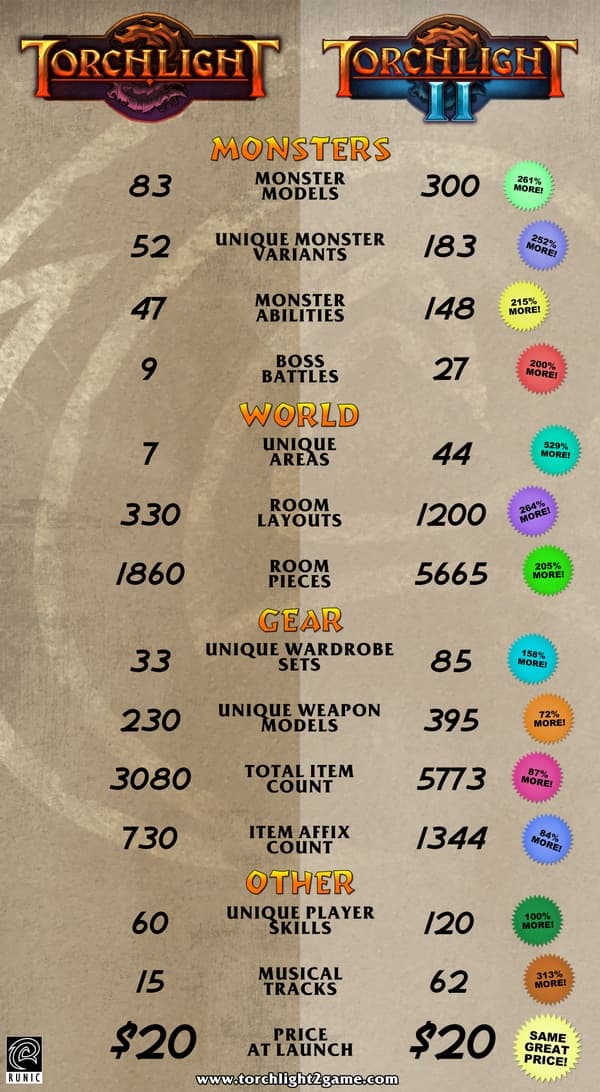 В Torchlight II на 261% больше моделей монстров, на 215% больше способностей у ваших врагов, ровно в три раза больше схваток с боссами. Если в первой части было всего 7 уникальных локаций, то в сиквеле их целых 44. Остальное сравнение вы найдете на следующей картинке.