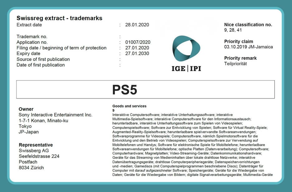 27 января 2020 года японский производитель зарегистрировал обозначение «PS5» в Швейцарском федеральном институте интеллектуальной собственности. Заявка подана в рамках 9 класса, который включает игровые консоли.