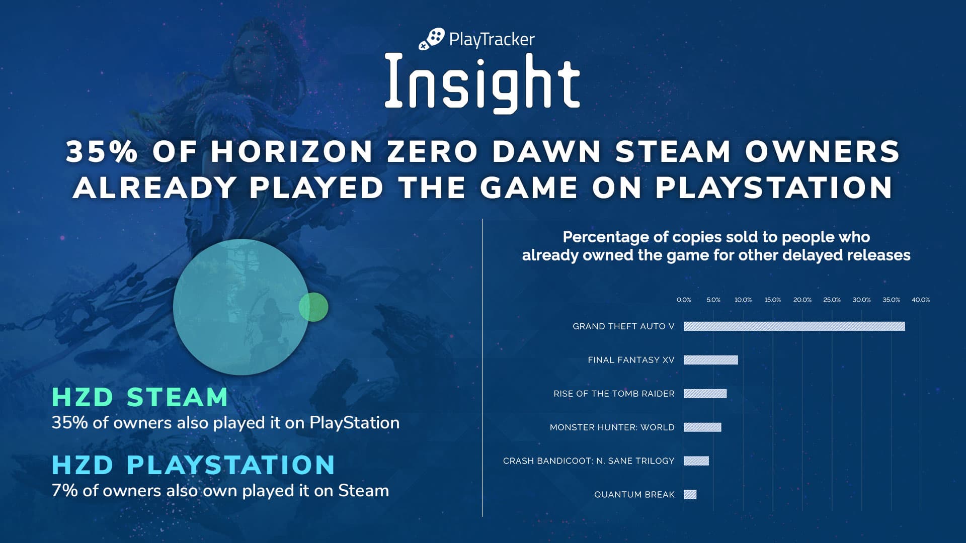 Интересную информацию предоставил независимый сервис PlayTracker, который собирает данные с отдельных платформ через API и собственные скрипты. По информации портала, до 35% людей, купивших Horizon: Zero Dawn в Steam владеют игрой на PS4. Также в общей сложности 7% владельцев оригинальной консольной версии приобрело копию игры в магазине Valve.