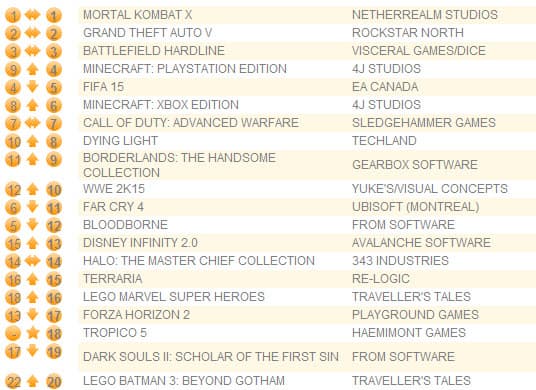 Первые три места занимают все те же игры, вторую неделю подряд лидирует Mortal Kombat X, следом идет GTA V, а за ней следует Battlefield: Hardline.