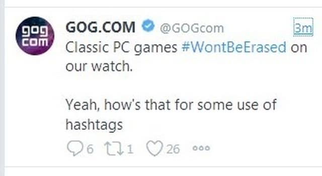 Магазин GOG опубликовал в твиттере сообщение, в котором говорится: «Классические PC-игры не будут стёрты, под нашим присмотром. Да, как насчёт такого использования хэштега».