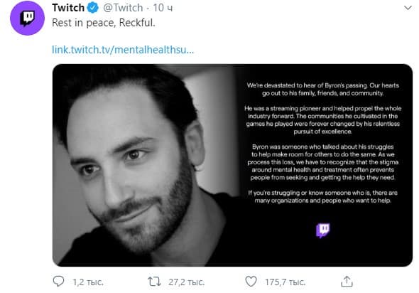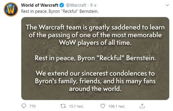 Байрон «Reckful» Бернштейн – один из первых и известных стримеров на Twitch. Фанат World of Warcraft и Hearthstone покончил жизнь самоубийством и его память почтили игроки в WoW.