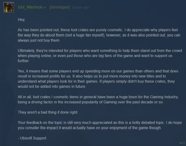 «Да, это значит, что некоторые игроки потратят больше денег в наших проектах, чем другие. В результате мы получим больше прибыли. Это поможет нам вложить больше денег в новые проекты и понять, что пользователи хотят увидеть в играх. Если бы люди попросту не покупали контейнеры, то их бы не добавляли в игры», - заявил Ubi_Warlock и добавил, что не видит ничего плохого в лутбоксах и косметических вещах, «если они правильно сделаны».