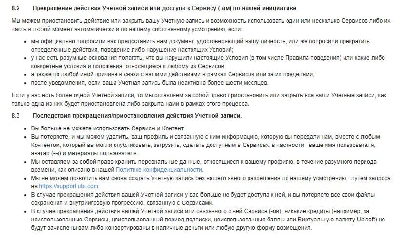 К тому же, Ubisoft может попросить предоставить документ, подтверждающий личность владельца, в любой момент, а также в случае разумных предположений в нарушении условий пользования прекратить доступ к сервису.
