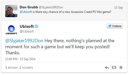В твиттере Ubisoft поклонник серии задал ворос о том, существует ли вероятность появления новой игры серии на данной портативной консоли. Представитель Ubisoft ответил, что ничего подобного в данный момент не планируется.