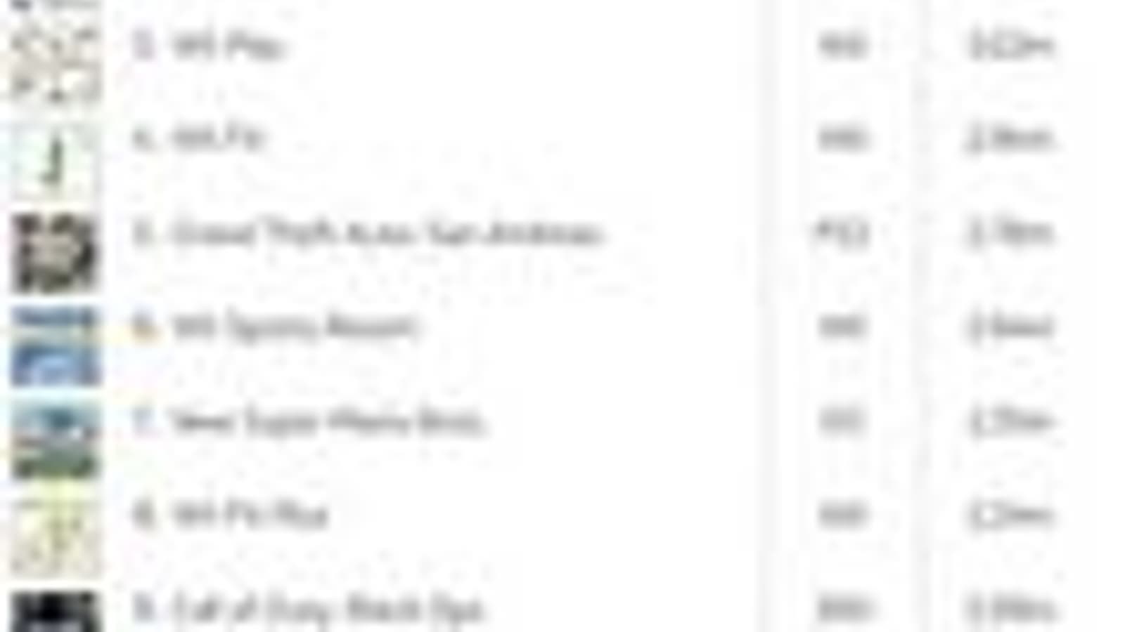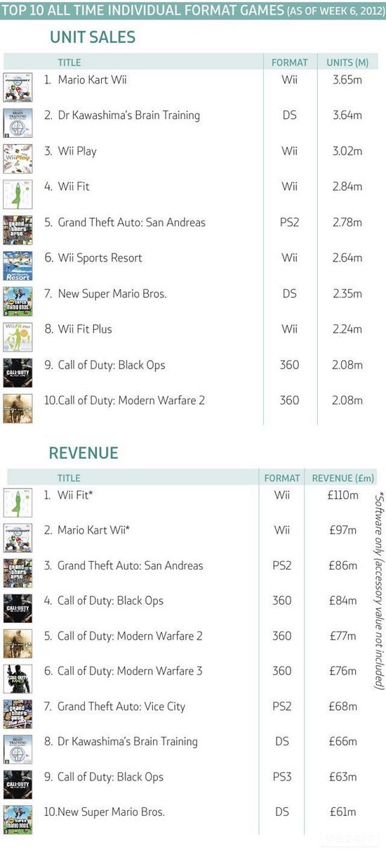 По количеству реализованных копий на одной платформе лидирует Mario Kart Wii, следом идет Dr Kawashima's Brain Training для DS, замыкает тройку лидеров Wii Play. Вообще Nintendo является безоговорочным фаворитом, ее игры заняли семь из десяти позиций. На пятую позицию пробилась Grand Theft Auto: San Andreas для PS2, а последние два места заняли Black Ops и Modern Warfare 2 - еще одно подтверждение недавно появившейся информации о том, что Modern Warfare 3 продается не так хорошо, как в первые дни после релиза.
