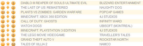 Второе место занимает The Last of Us: Remastered, также в десятке оказалась еще одна новинка в лице Tales of Xillia 2.