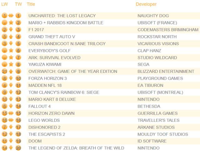 Компания Chart-track опубликовала свежие данные о продажах игр на территории Соединенного королевства. На первом месте осталось самостоятельное дополнение Uncharted: The Lost Legacy для PS4. Тактическая стратегия Mario + Rabbids Kingdom Battle для Switch дебютировала на второй строчке.