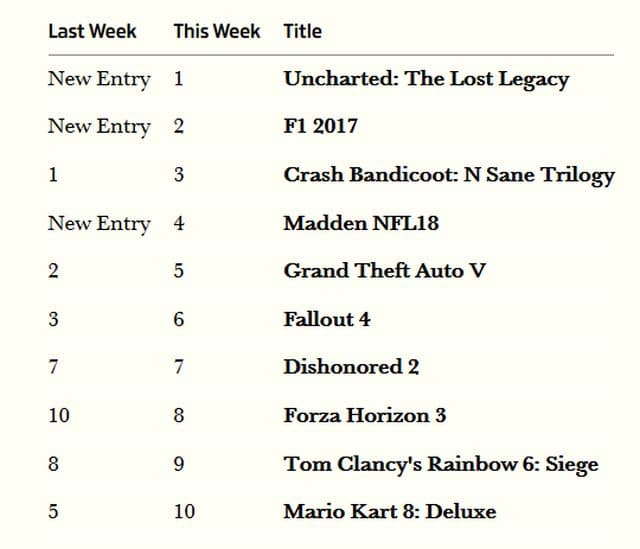 Компания Chart-track опубликовала свежие данные о продажах игр на территории Соединённого королевства. На первой строчке обосновалось самостоятельное дополнение Uncharted: The Lost Legacy для PS4. Дополнение, ожидаемо, продаётся не так хорошо, как Uncharted 4.