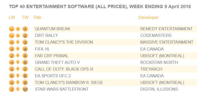 Компания Chart-track опубликовала подробные данные о продажах игр на территории Соединённого Королевства за прошлую неделю. Как мы уже сообщали, первую строчку оккупировал боевик Quantum Break. Это первый эксклюзив (в данном случае - консольный) для Xbox One со времён Halo 5, которому удалось захватить лидерство в британском чарте продаж.