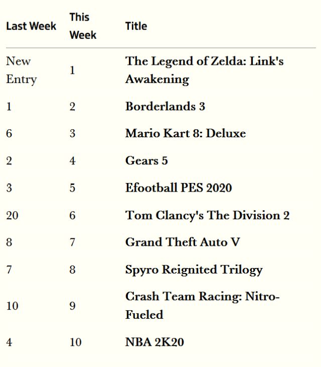 Лидер прошлой недели Borderlands 3 опустился на вторую строчку, а продажи игры снизились на 69%. Gears 5 опустилась на четвёртое место, продажи игры снизились на 74%. Ролевая игра Greedfall опустилась с пятого на 28-е место, а продажи снизились на 78%.