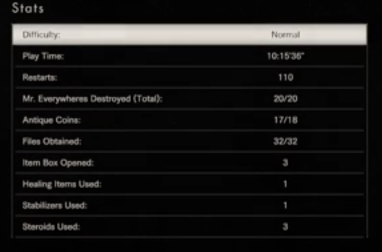 На одном из форумов появился скриншот со статистикой прохождения одного из игроков, из которого видно, что ему потребовалось 10 часов 15 минут для завершения игры на «нормальной» сложности. Возможно, Resident Evil 7 учитывает чистое время без рестартов и катсцен. Ранее сообщалось, что кампания займёт от 15 до 20 часов.