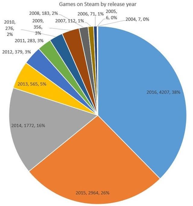 Если сравнивать с 2016 годом, то количество игр почти удвоилось. За 2016 год было выпущено 4207 игр, что составляло 38% всех игр Steam на сегодняшний день. Для сравнения в 2015 году вышло 2964 игры, в 2014 – 1772, а в 2013 всего 565.