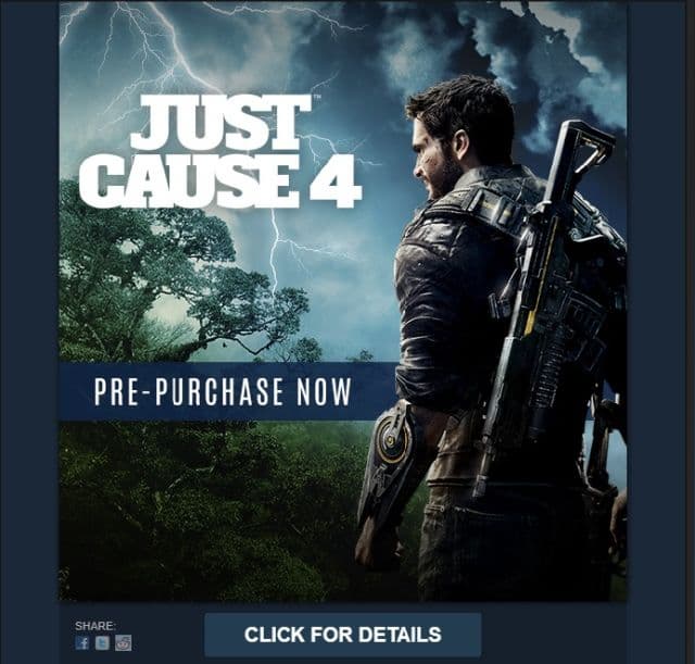 В возвращении Рико Родригеса можно не сомневаться. Шведская студия Avalanche работает не только над Rage 2 и Generation Zero, но и над Just Cause 4. Утечка произошла из-за сбоя или ошибки в Steam. В списке новых и доступных для предзаказа игр появился рекламный баннер Just Cause 4. Позже изображение убрали.