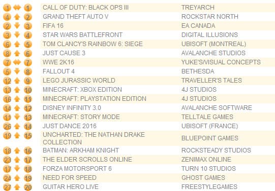 Шутер от первого лица Call of Duty: Black Ops III опять занял первое место, хотя продажи игры снизились на 24%. Игра удерживается на первой позиции шесть недель подряд, повторив рекорд FIFA 15 в 2014 году.