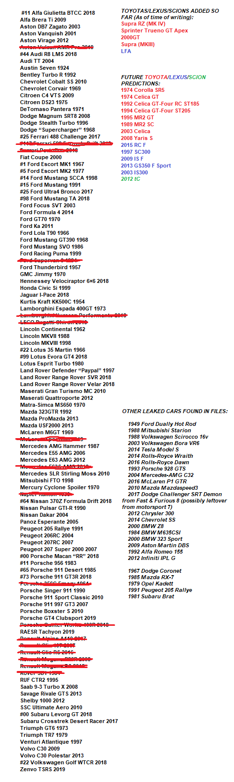 Стоит отметить, что список основан на информации, найденной в файлах игры и некоторые из автомобилей уже появлялись в проекте (те, которые зачёркнуты на изображении).