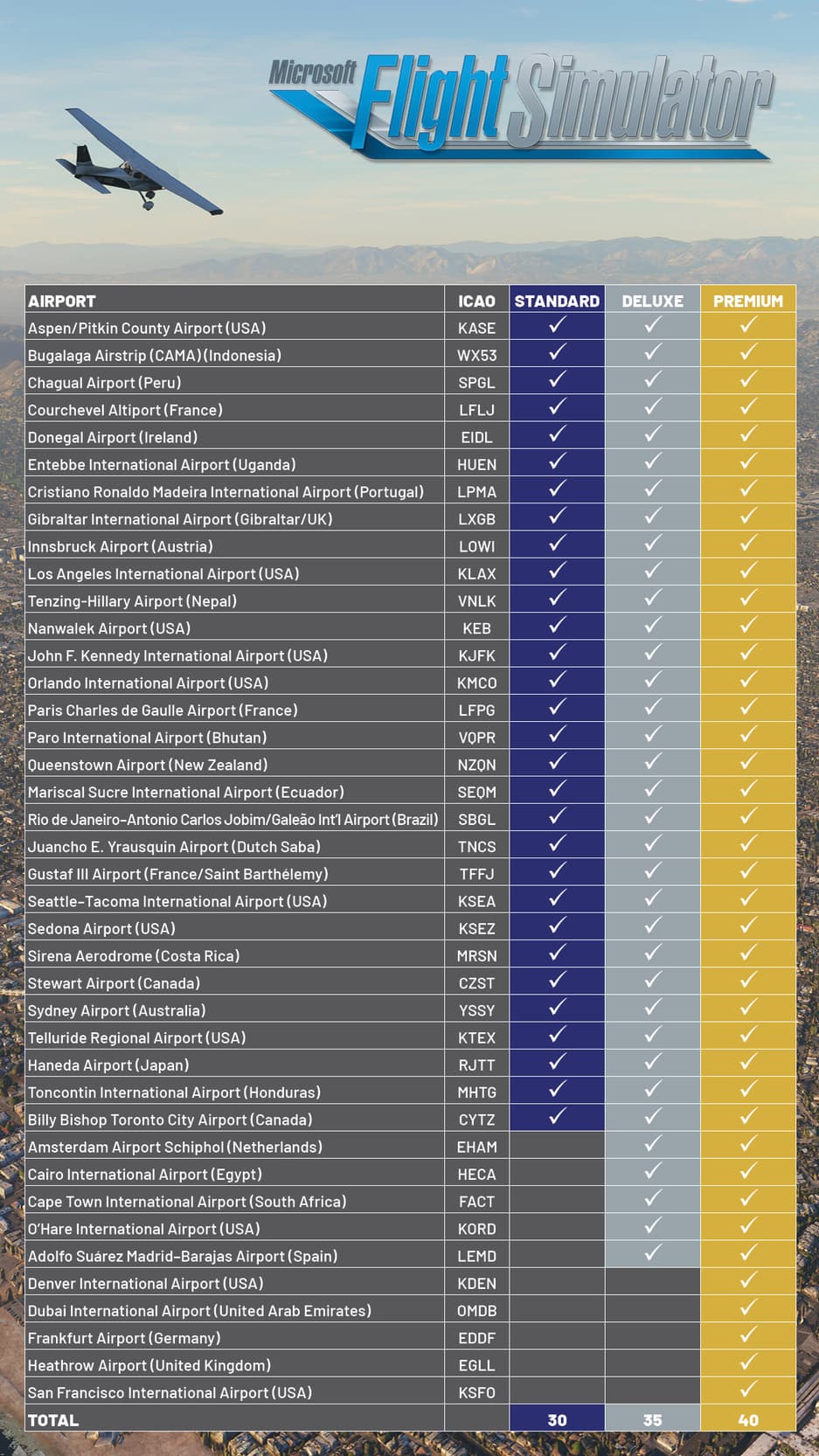 «Microsoft Flight Simulator включает в себя почти все аэропорты мира, которые находятся на картах Bing, а их около 37 000. Однако из этих 37 000 аэропортов мы специально проработали 40 (в зависимости от издания - 30 для Standard Edition, 35 для Deluxe Edition, 40 для Premium Deluxe) для максимально реалистичного погружения».