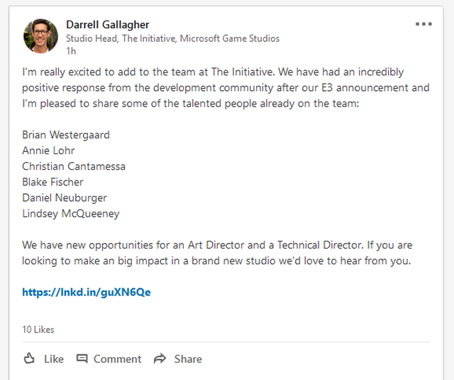 Даррел Галлахер, глава недавно созданной студии The Initiative, принадлежащей Microsoft, опубликовал объявление в LinkedIn со списком известных в игровой индустрии сотрудников. Спустя некоторое время сообщение было удалено, но остался скриншот.