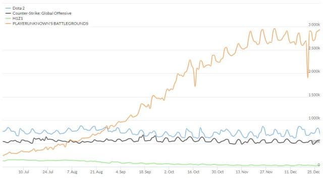 Сетевой боевик PlayerUnknown’s Battlegrounds продолжает обновлять собственные рекорды, и никакие читеры ему не помеха. По данным ресурса Steam Database, в определенный момент в PlayerUnknown’s Battlegrounds одновременно играло более 3 миллионов человек.