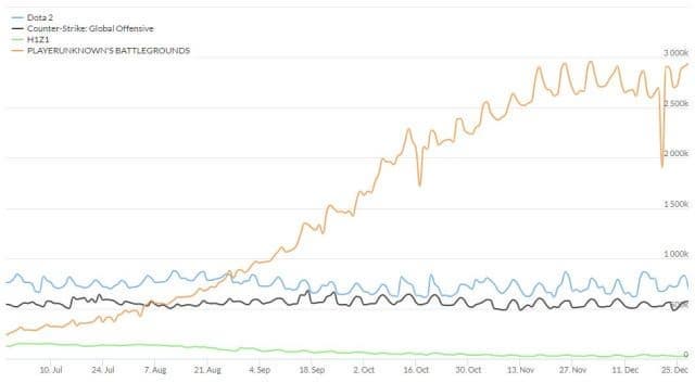 Также Steam Database опубликовал график, на котором показан рост популярности PlayerUnknown’s Battlegrounds в сравнении с проектами DOTA 2, H1Z1 и Counter-Striker: Global Offensive. Как видно на графике, ни одному из проектов из сервиса Steam не удалось приблизиться к показателям PUBG по количеству одновременно играющих пользователей.