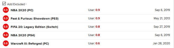 Проект от Blizzard пропустил вперёд и перегруженный микротранзакциями симулятор баскетбола NBA 2K20 (0,8 балла), и отвратительную гоночную игру Fast & Furious: Showdown (0,9 балла) и кошмар игровой индустрии Ride to Hell: Retribution (1,1 балла).