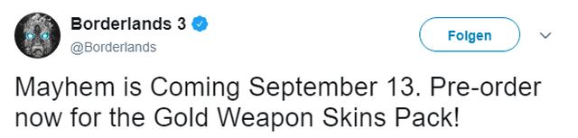В официальном твиттере Borderlands 3 ненадолго появилось сообщение о том, что проект появится 13 сентября, а оформившие предварительный заказ на игру пользователи получат комплект золотых раскрасок для оружия.