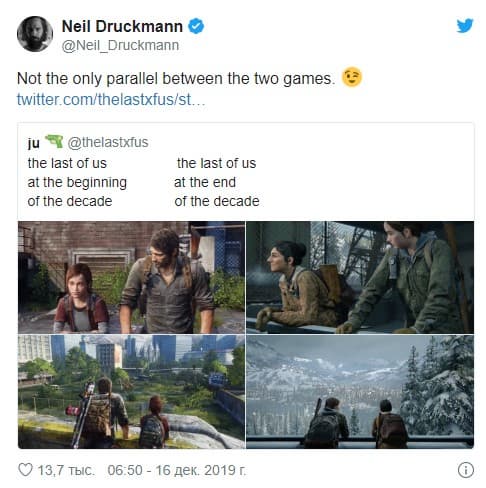 Вице-президент Naughty Dog и геймдиректор The Last of Us: Part II Нил Дракманн в твиттере опубликовал твит в ответ на сообщение одного из фанатов, в котором демонстрируются похожие кадры из двух игр. По его словам, это не единственные аналогии в двух проектах. Дракманн не уточнил, что именно он имеет в виду. Вероятно, речь идёт о сюжетных отсылках.