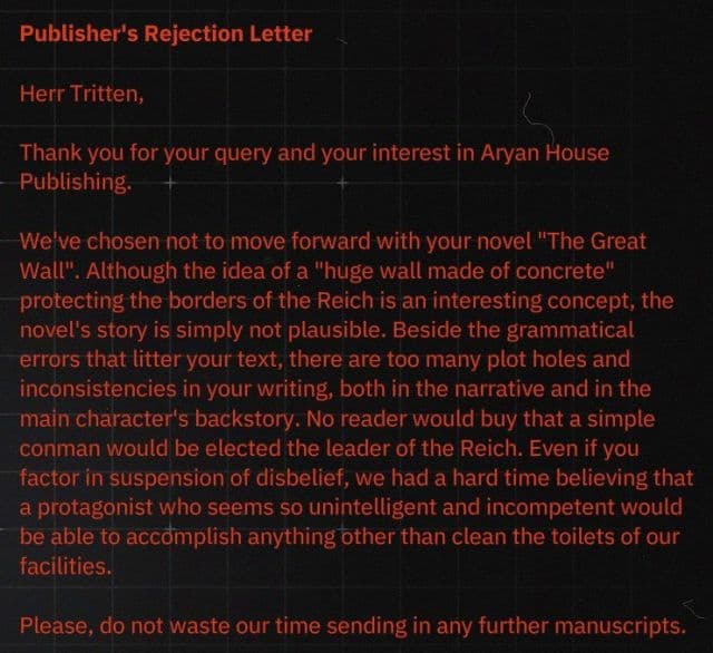 В новой Wolfenstein: Youngblood есть множество коллекционных предметов (письма, фрагменты газет), которые дают представление о мире игры. И в одной из найденных фанатами заметок идёт речь о письме издателя человеку по имени Триттен, написавшему роман «Великая стена». В книге говорится об идее постройки огромной стены, которая защитит границы Рейха. Однако написана она со множеством грамматических ошибок и сюжетных нестыковок. Также издатель упоминает, что человека, упомянутого в романе, никогда бы не избрали лидером Рейха и он не смог бы претендовать на должность выше, чем уборщик туалетов.