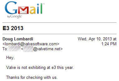Даг Ломбарди (Doug Lombardi) из Valve, отвечая на вопрос ValveTime о том, будет ли компания что-то показывать на грядущей выставке Е3 в июне, заявил, что Valve не будет выступать на E3.