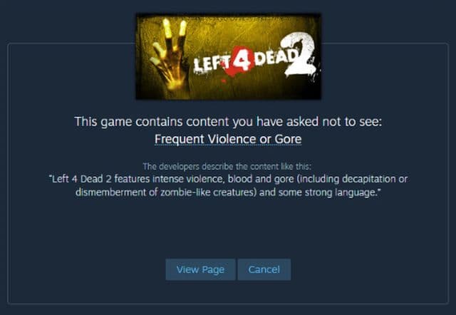 Авторы игр с насилием и эротикой отныне обязаны предоставлять Valve описание неподобающего контента. Эта информация появляется перед тем, как вы заходите на страницу игры в Steam. Например, в случае с Left 4 Dead 2 вы увидите, что игра содержит «кровь и насилие (включая расчленение существ, похожих на зомби) и нецензурную брань». Подобные описание от разработчиков должны быть у всех жестоких и эротических игр.